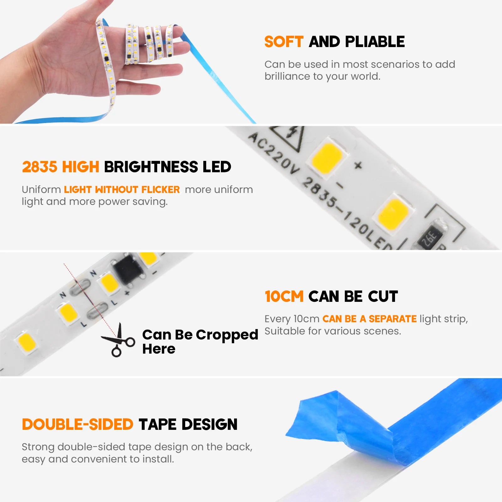 10m 20m 50m 220V 2835 LED Strip Light No Need Driver High Bright 120LEDs/M Flexible Tape Lights IP44 Waterproof Home Lighting