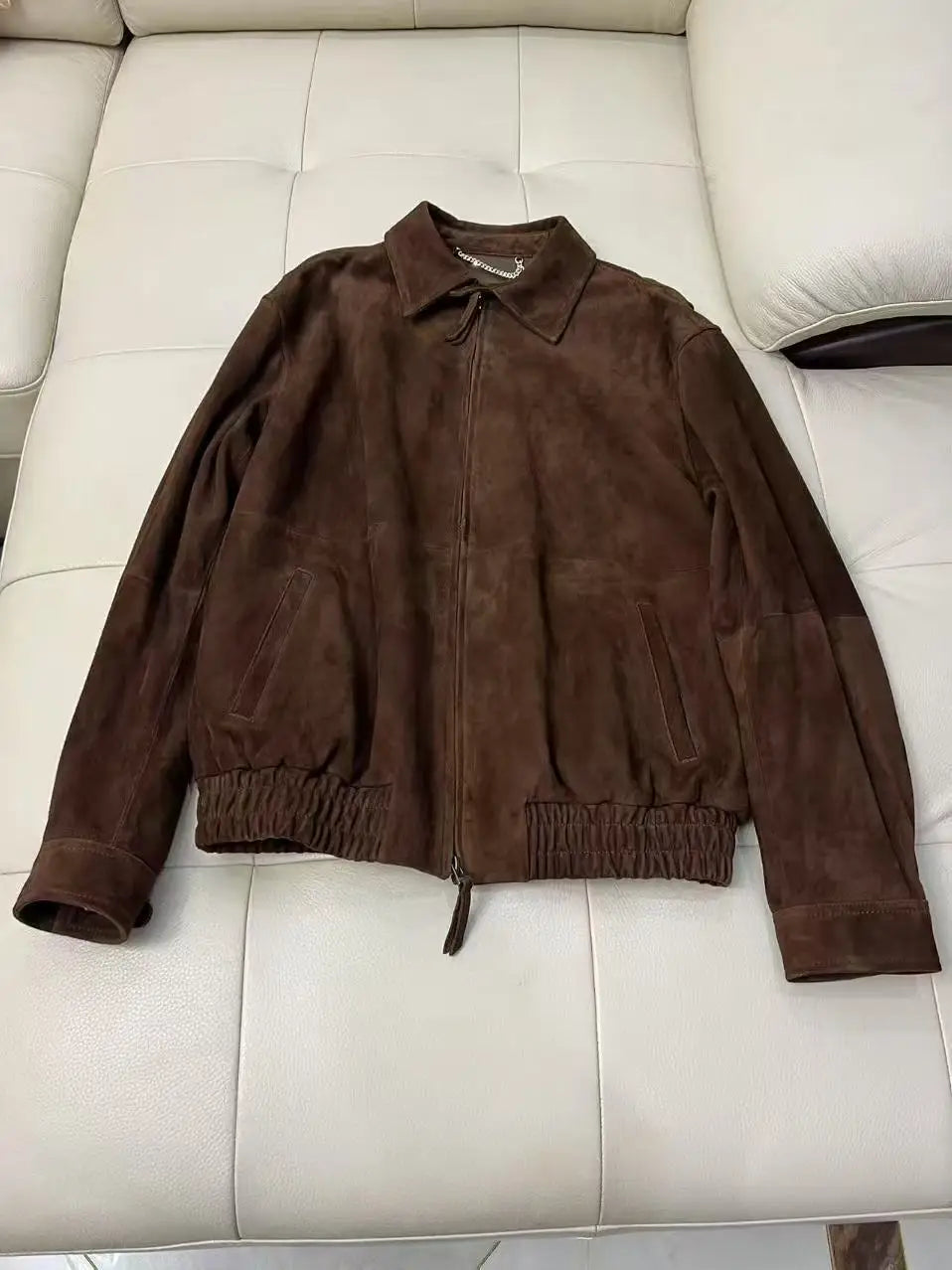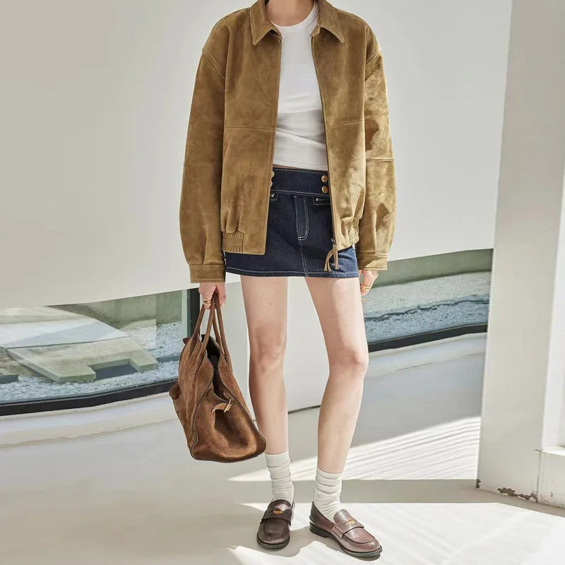 Brown Suede Jacket Spring Women Sheepskin Vintage Old Money Style Wide Shoulder Casual Baseball Leather Coat Giacca Pelle Donna