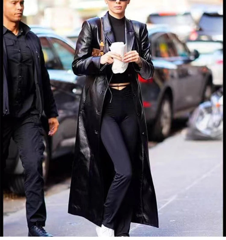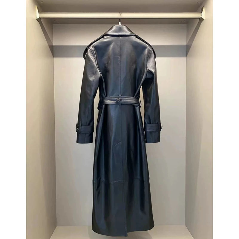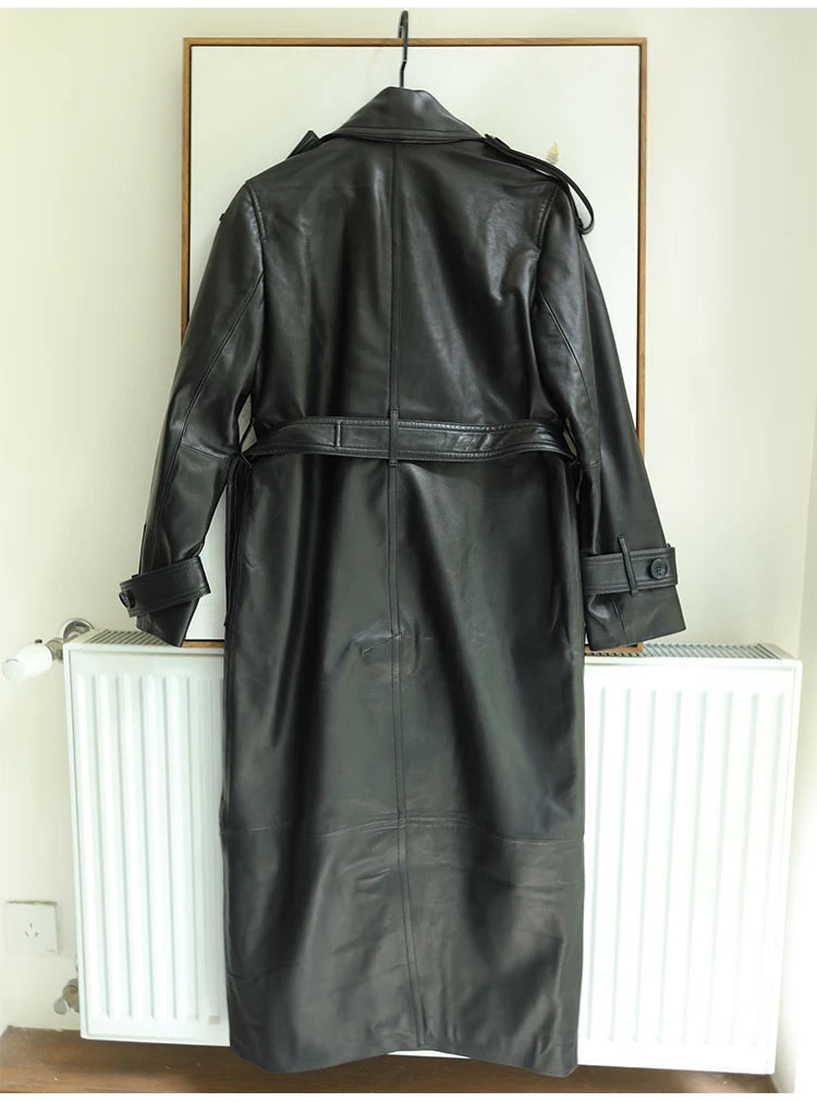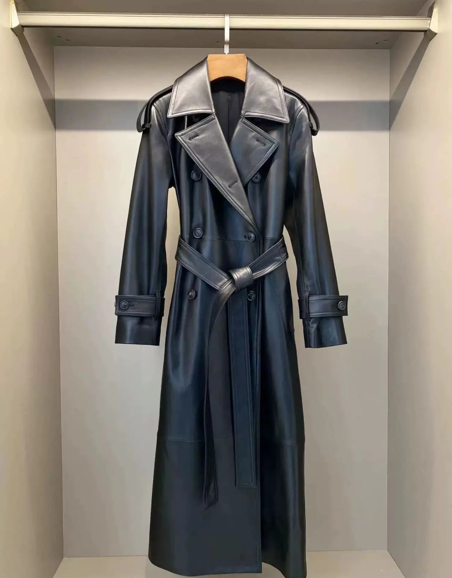 Women Leather Jacket Autumn Winter Black/Red Coffee Sheepskin Lapel Double Breasted Belt Slim Show Tall Long Trench Coat Dress