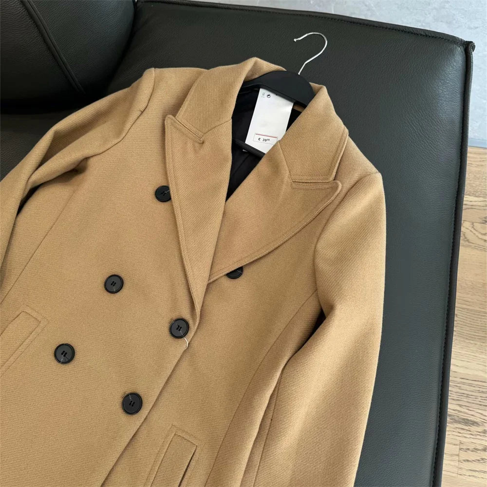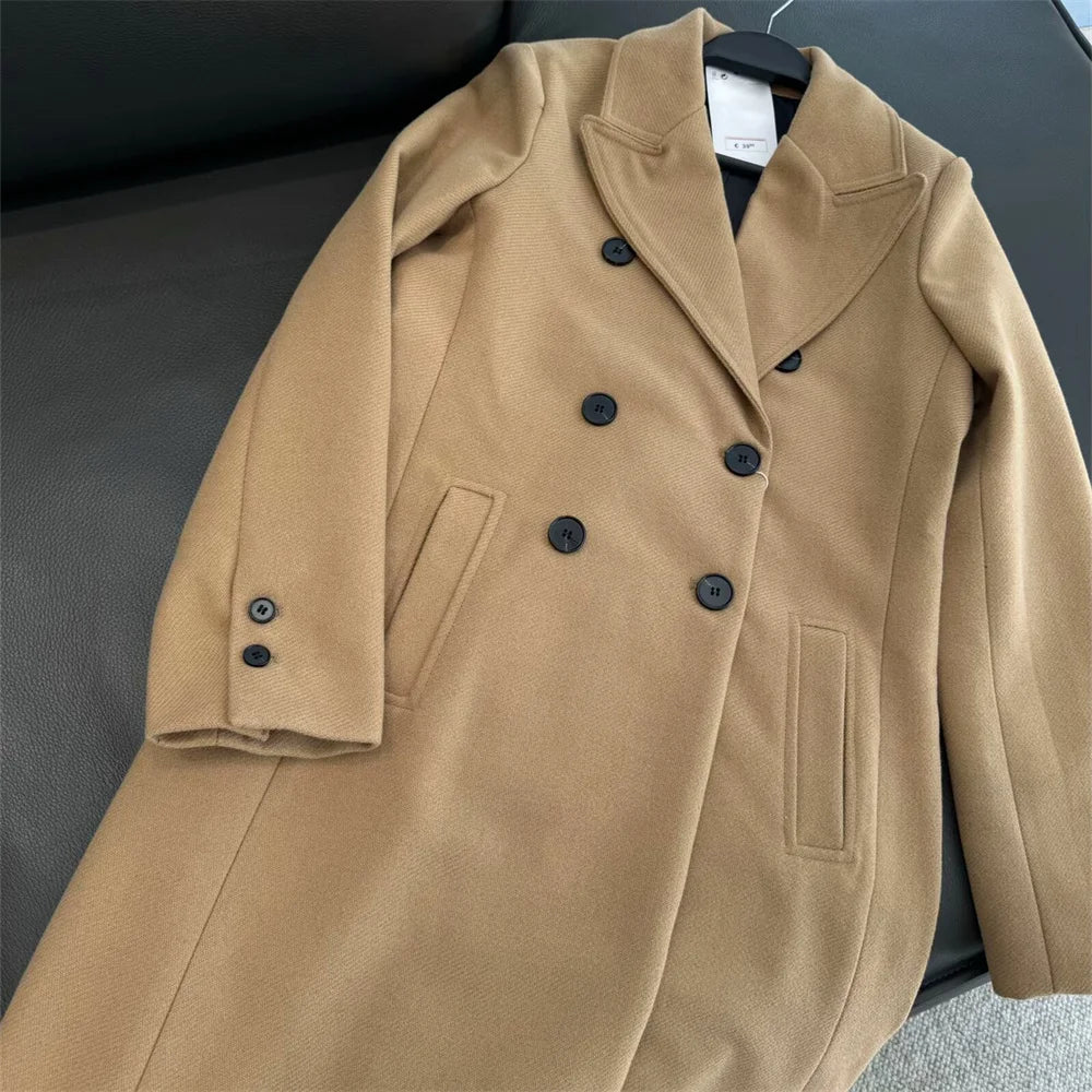 women's suit collar double breasted woolen medium long coat winter new fashion solid color long sleeved coat