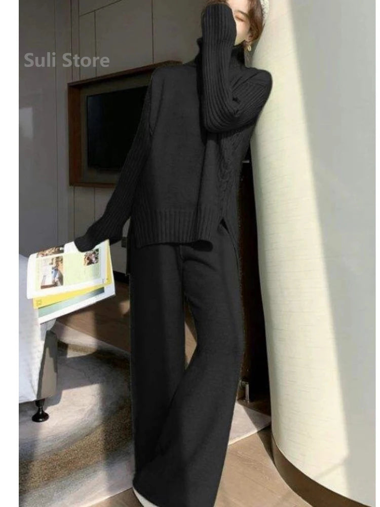 Wool 2023 Autumn and Winter New Loose Turtleneck Sweater Suit Female Western Style Fashion Wide Leg Pants Two-Piece Set Female