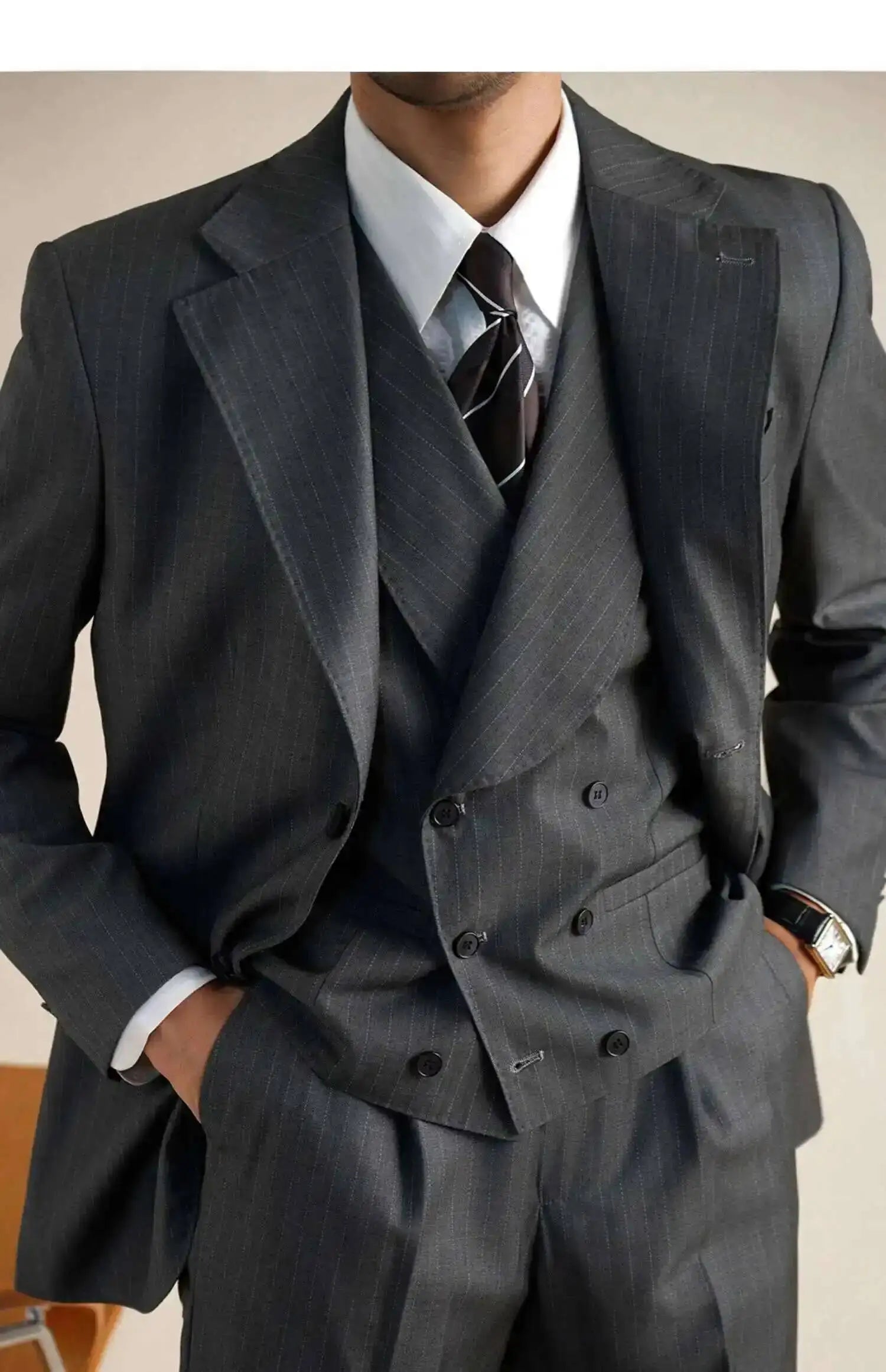 Wool Italian Blazers Suit For Men Business Double Breasted Wedding Tuxedo Suit Smoking Homme Mariage Striped Suit 3 Piece Homme