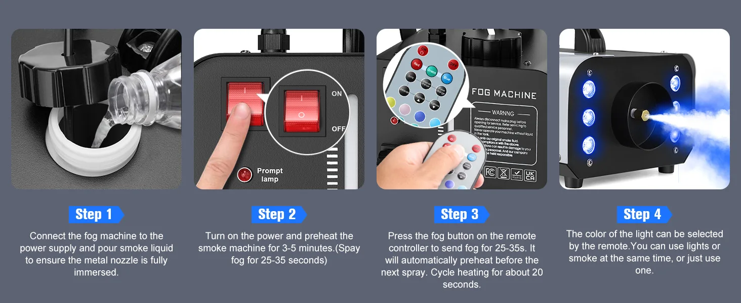1. The machine can automatically cycle smoke, do not need to press the remote control every time you spray smoke.