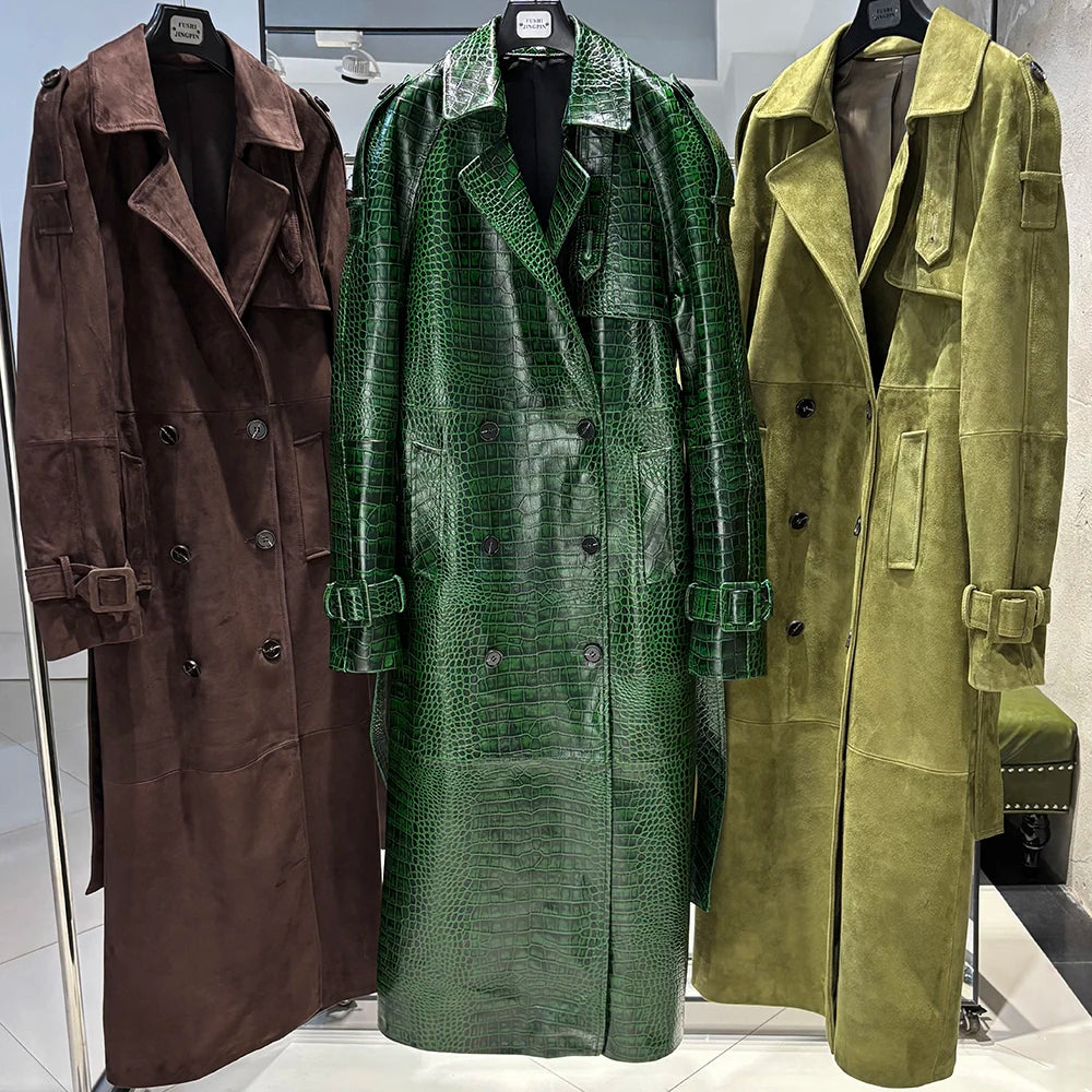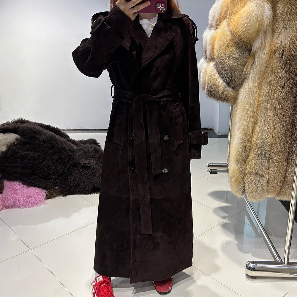 YOLOAgain Double Breasted Suede Jacket Coat Women Real Leather Trench Coat