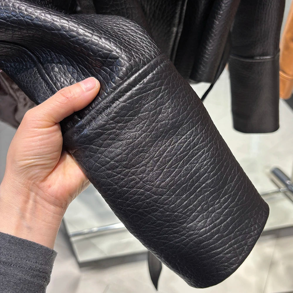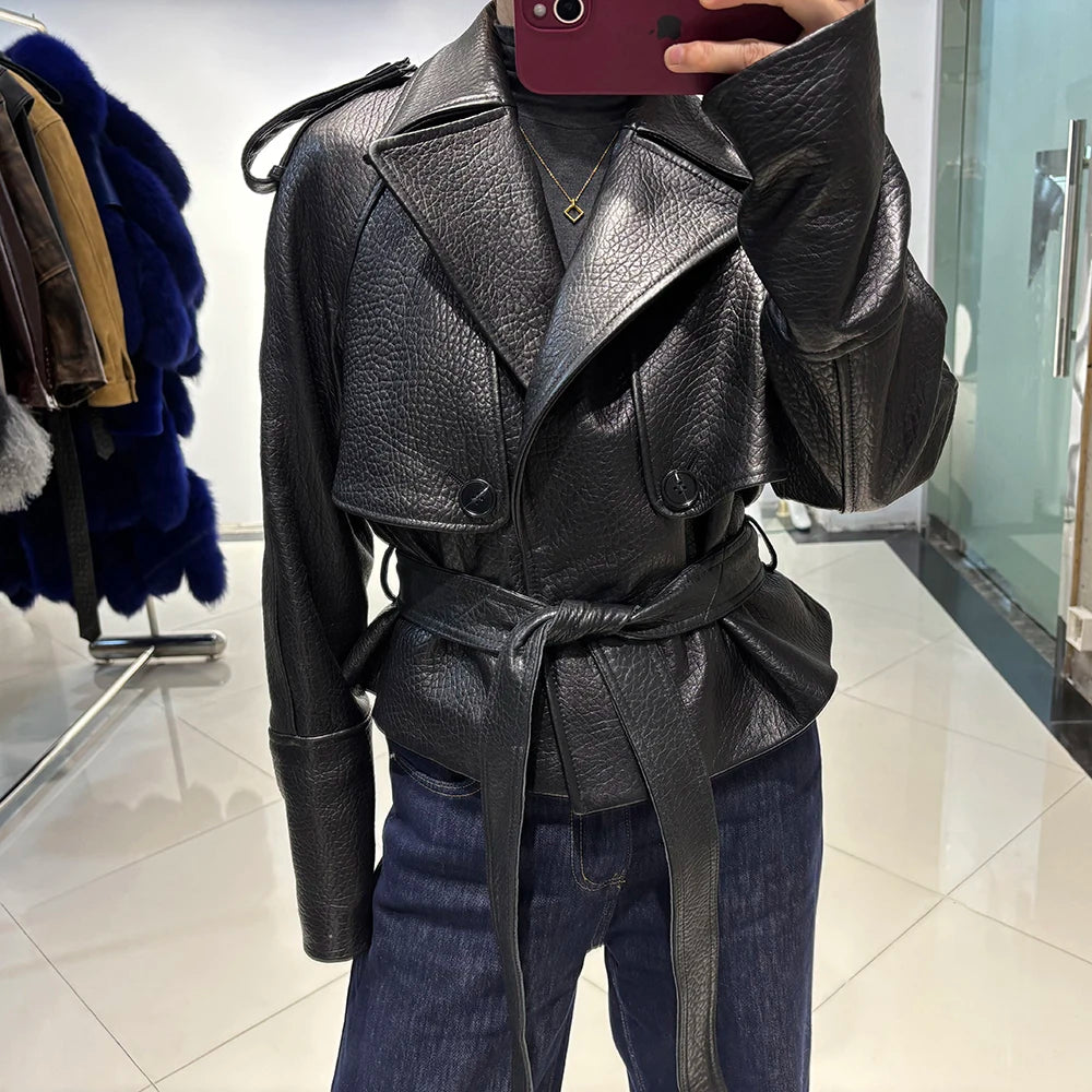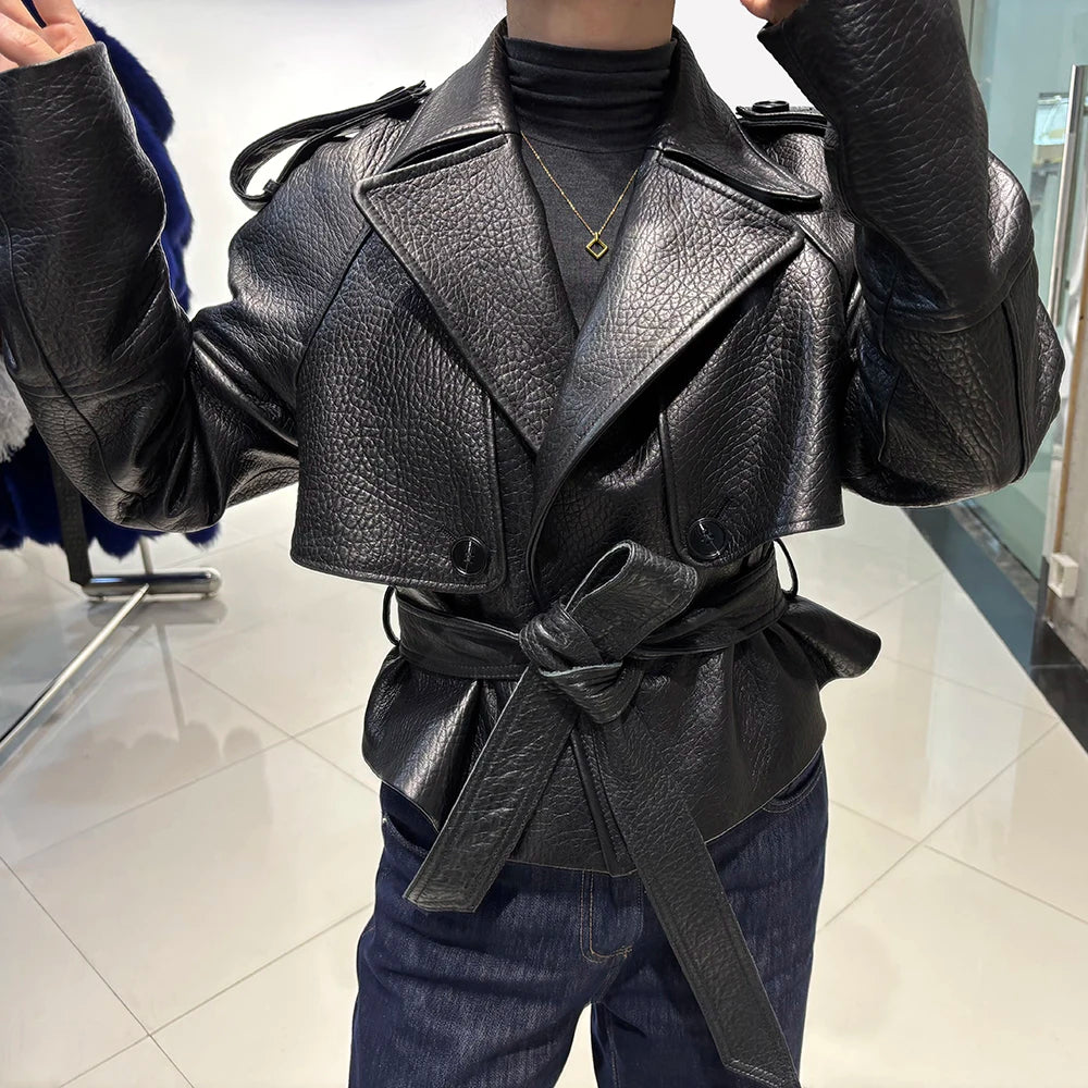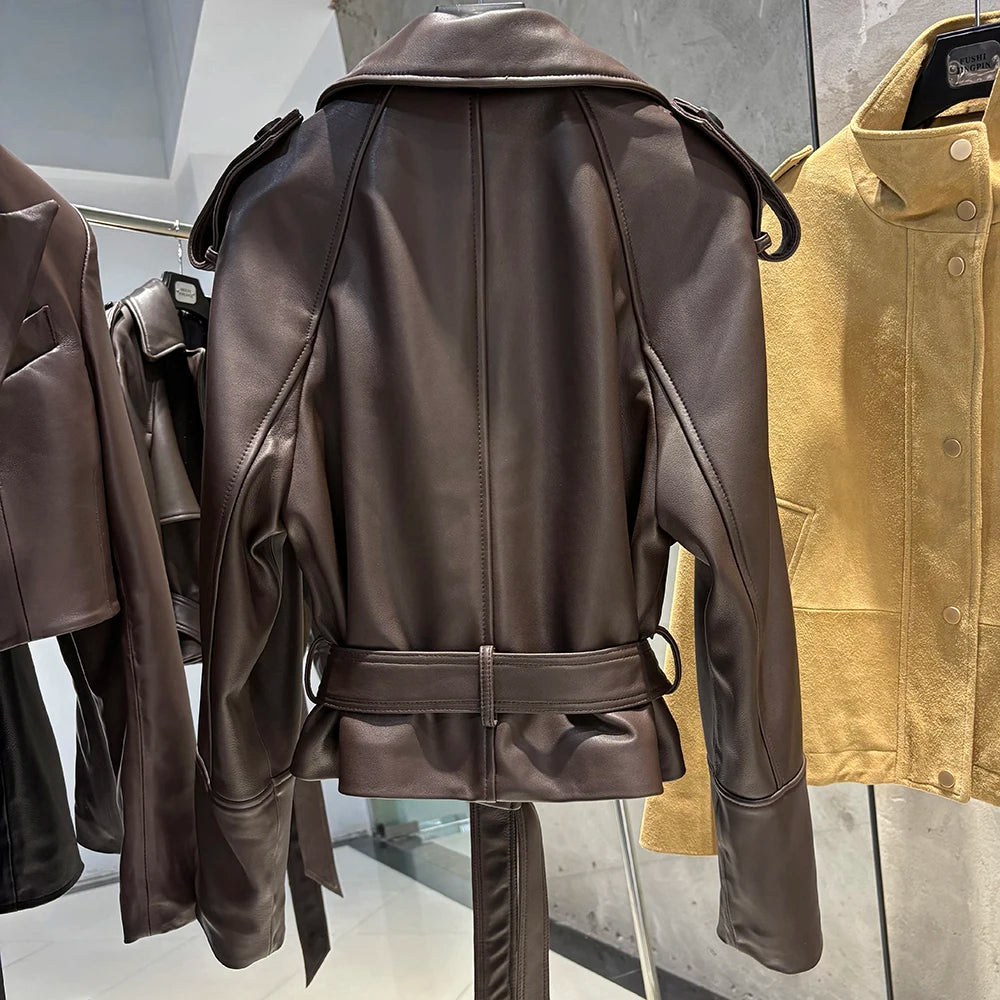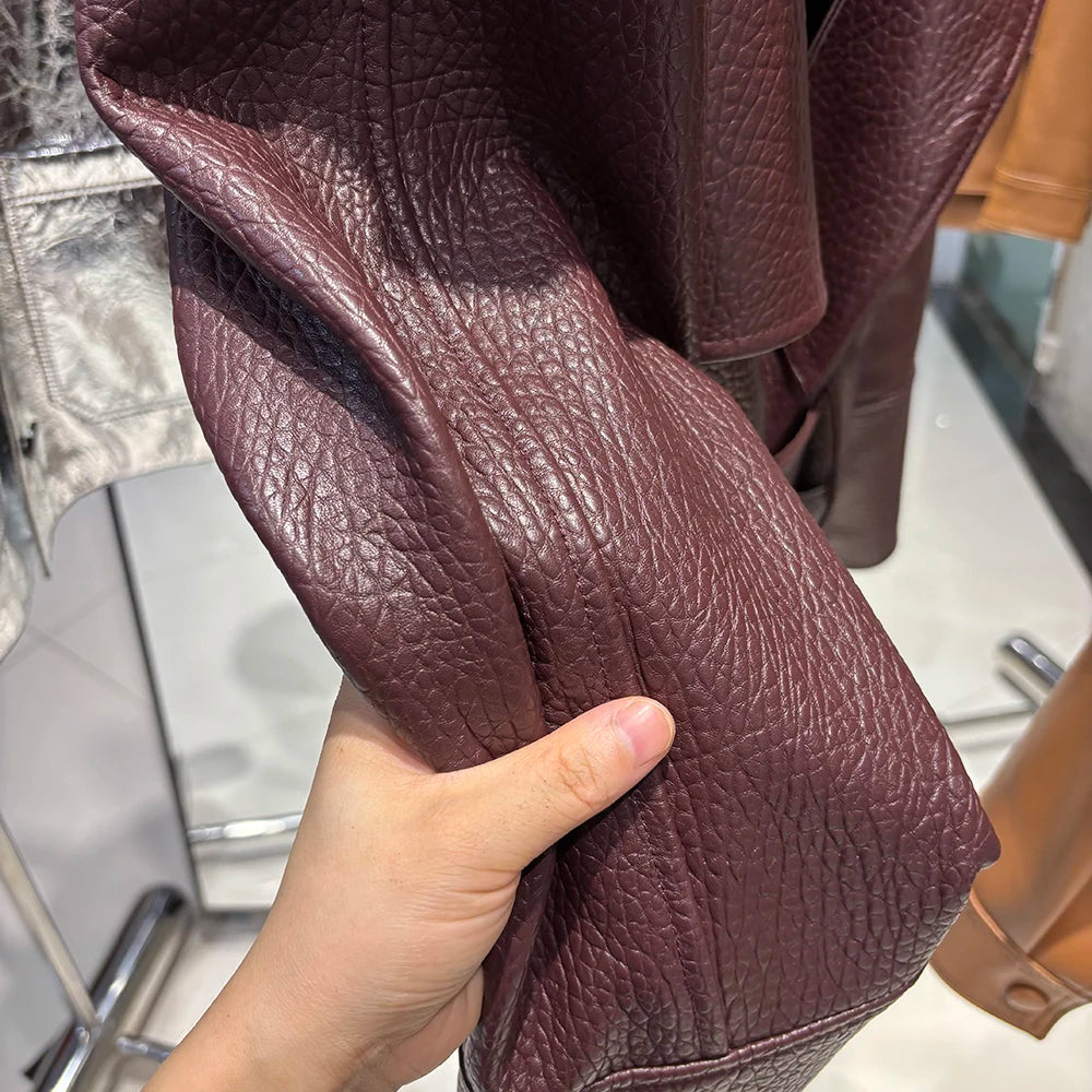 YOLOAgain Real Leather Jacket Women Burgundy Grain Leather Jacket With Belt