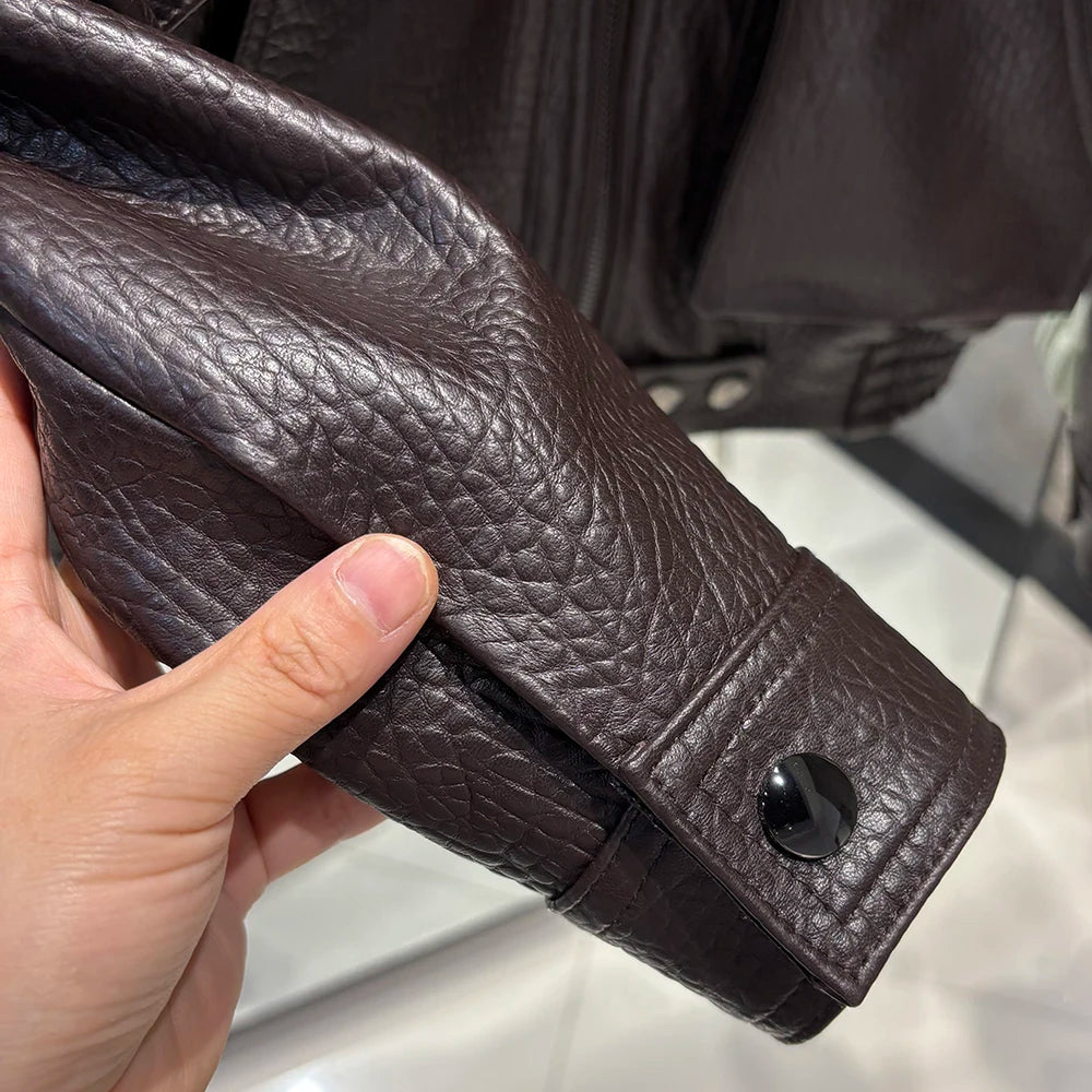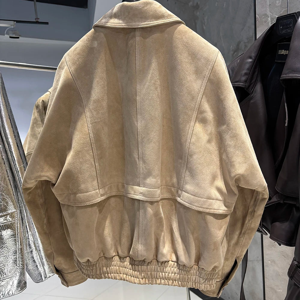 YOLOAgain Women Real Leather Jacket Oversized Light Khaki Suede Leather Jacket Coat With Collar